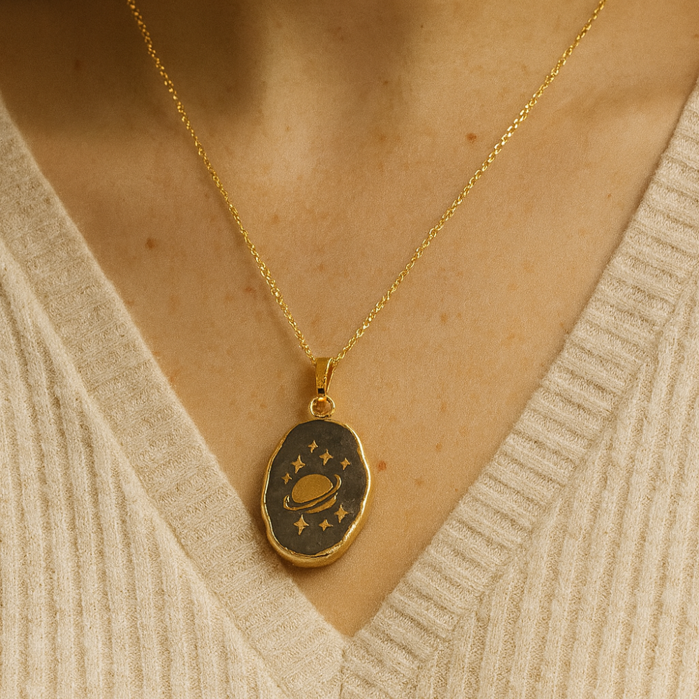 A: The Celestial Astrology Necklace is made with beautiful crystals, jades, composite stones, and high-quality stainless steel.