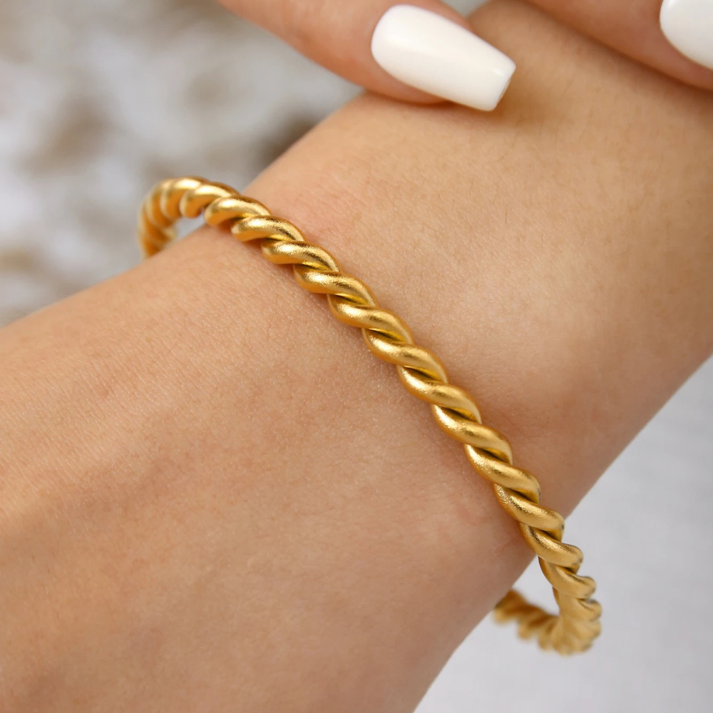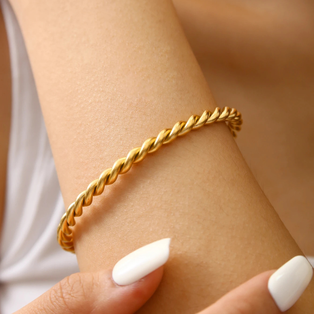 The Twisted Chain Bracelet is a beautiful piece that blends elegance with everyday charm. Its sleek, intertwined design catches the light and adds a subtle sparkle to your look.